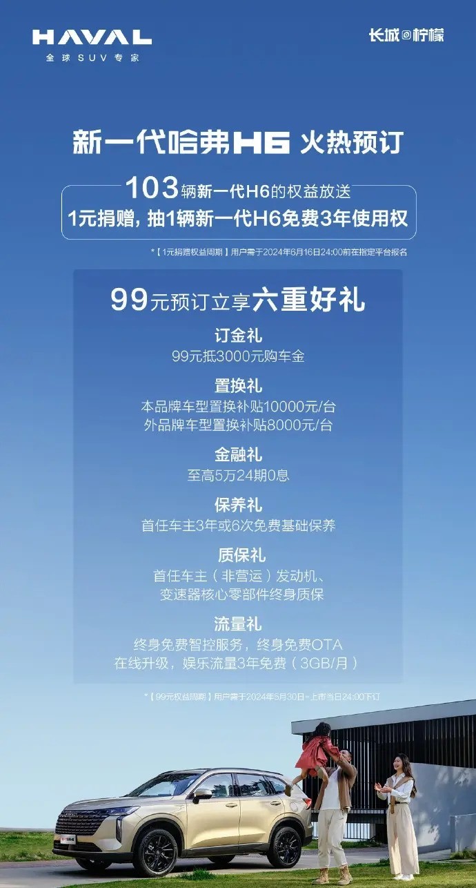 同时,官方还推出了1元捐赠活动,将抽取103名幸运儿获得三年使用权的全新哈弗H6汽车。