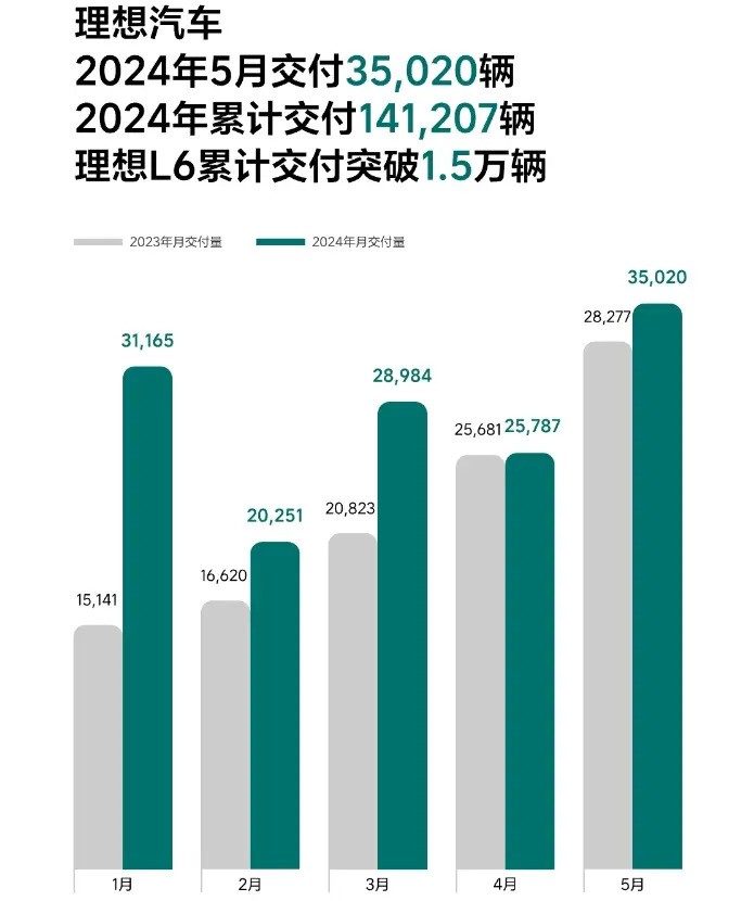 2024年5月,理想汽车公布了其交付成绩。该公司共计交付35,020辆汽车,同比增长了23.8%。今年迄今为止,理想汽车的累计交付量已达到141,207辆。