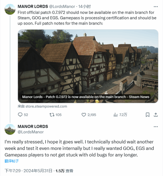 中世纪城市建设游戏《庄园领主》近期推出了0.7.972补丁,这次更新涉及大量平衡性调整和错误修复等内容。然而,在补丁发布后,《庄园领主》的开发团队却表达了他们紧张和压力重重的态度。