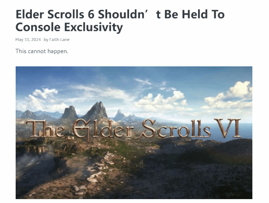自2018年发布预告片以来,《上古卷轴6》就鲜有新消息,去年的法庭文件显示该作将仅在Xbox和PC平台推出,不会登陆PS5。然而,《上古卷轴》是一个庞大的IP,其粉丝社区规模庞大,如果《上古卷轴6》只在指定平台上发售,将给玩家们带来不便。因此,gameranx认为《上古卷轴6》不应该只限于Xbox与PC平台。