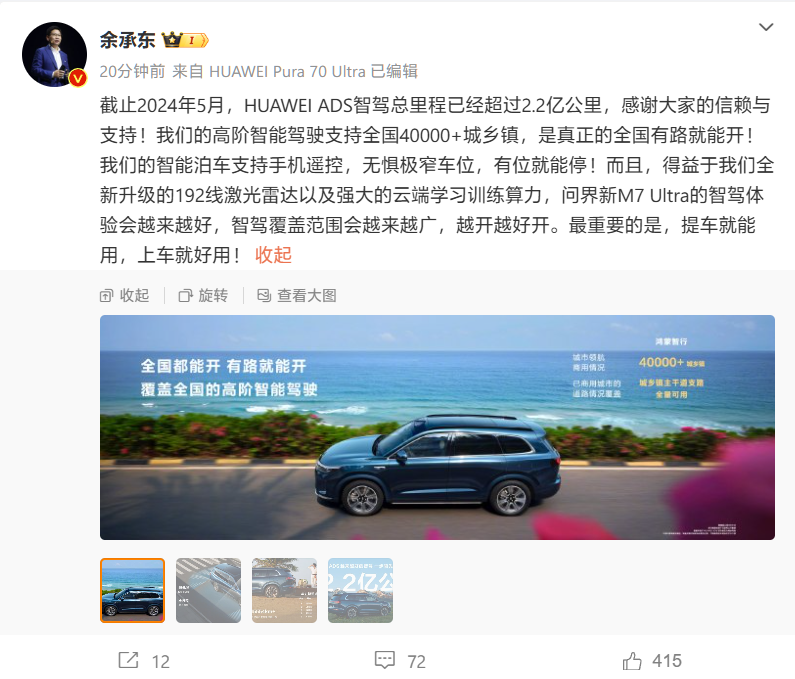 华为智能汽车解决方案 BU 董事长余承东发文称,截至 2024 年 5 月,华为 ADS 智驾总里程已经超过 2.2 亿公里,并且高阶智能驾驶已经支持全国超 40000 个城乡镇。这意味着华为的自动驾驶技术已经非常成熟,可以在全国范围内使用。