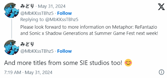 在昨日的State of Play发布会上,索尼公司公布了多款第一方游戏的消息。根据世嘉官方人员爆料,索尼还计划于6月7日举行的夏日游戏节上发布更多第一方游戏消息。