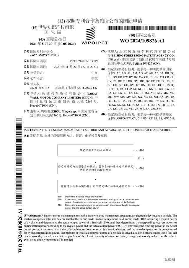 根据企查查数据,长城汽车(601633)近日公布了一项名为“电池的能量管理方法、装置、电子设备及车辆”的国际专利申请。该专利申请号为PCT/CN2023/133389,国际公布日为2024年5月30日。