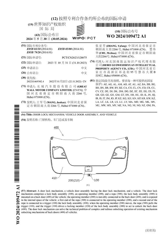 近日,长城汽车(601633)公布了一项国际专利申请,该专利名为“门锁机构、车门总成及车辆”,申请号为PCT/CN2023/128075,预计国际公布日为2024年5月30日。据企查查数据显示,今年长城汽车已公布了20个国际专利申请,较去年同期减少了55.56%。