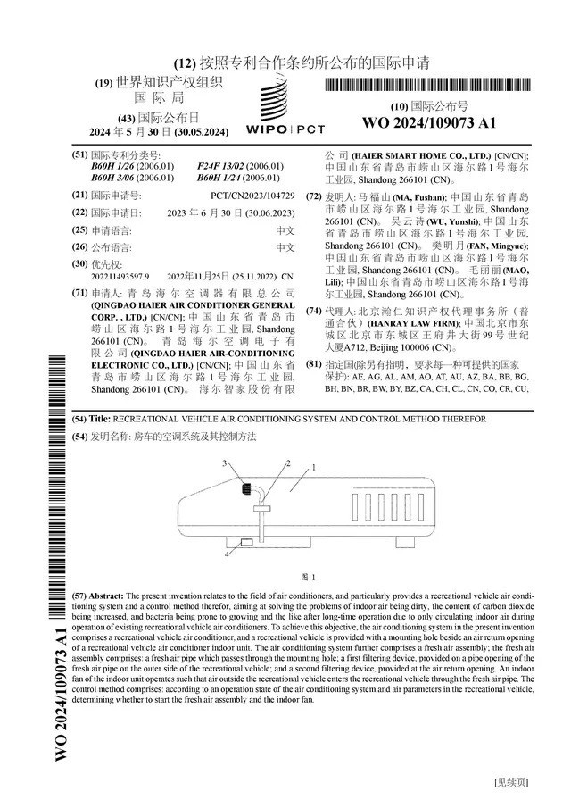 海尔智家最新公布一项名为“房车空调系统及其控制方法”的国际专利申请。根据企查查的数据显示,该专利的申请号为PCT/CN2023/104729,国际公布日定于2024年5月30日。