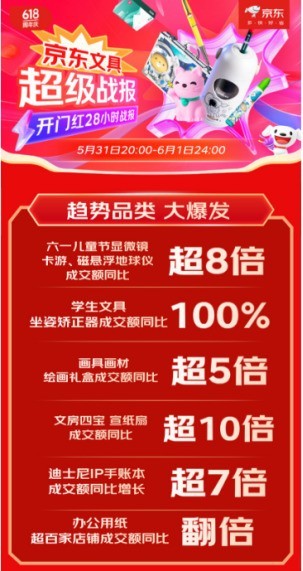京东618开门红28小时战报迎来全面增长,海量品质文具和多重钜惠福利激发了消费者文具抢购热情。数据显示,京东618开门红28小时,文具品类迎来大爆发,显微镜、卡游、磁悬浮地球仪成交额同比增长超8倍;文房四宝、宣纸扇成交额同比增长超10倍;迪士尼IP手账本成交额同比增长超7倍;绘画礼盒成交额同比增长超5倍;超百家店铺办公用纸成交额同比翻倍。