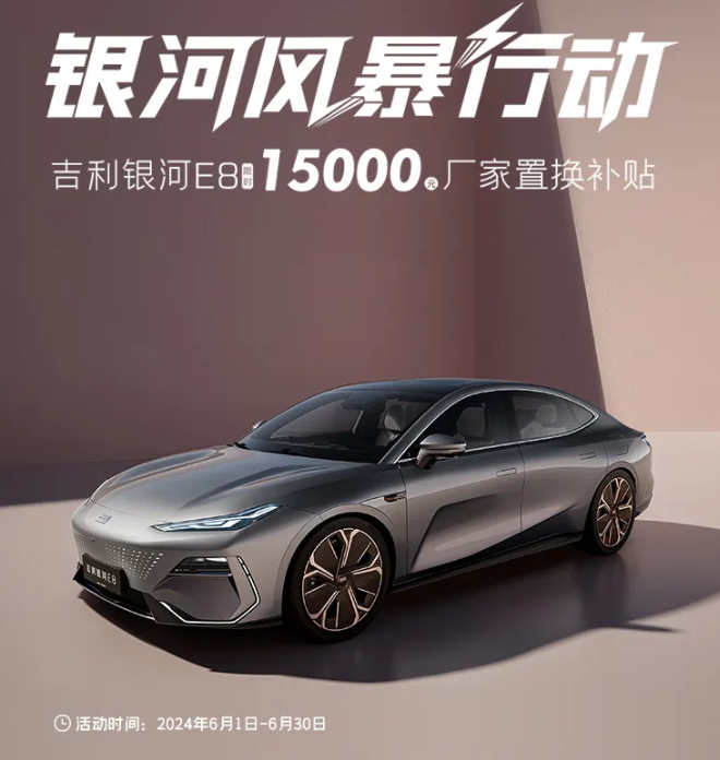 吉利银河E8系列汽车近日推出了限时1.5万元厂家置换补贴活动。活动时间为2024年6月1日至6月30日,覆盖了550km两驱龙腾版、550km Pro、550km Max、665km星舰远航版、620km四驱龙腾版以及665km星舰智驾版和620km星舰性能版等车型。