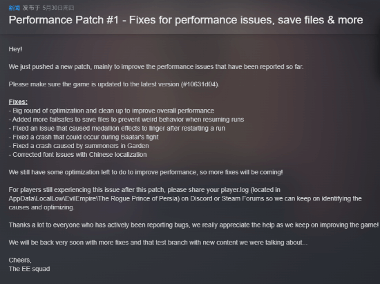 除此之外,《波斯王子:Rogue》已经修复了中文本地化的字体问题。开发团队表示,在未来将继续改善游戏性能。