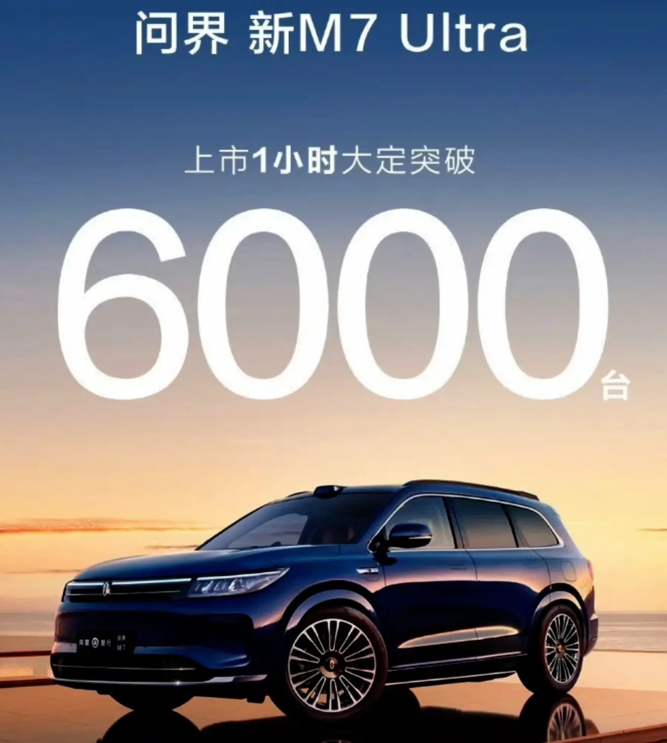 问界M7 Ultra在上市后首日便收获了12000台的预订量。仅过了一个小时,这一数字就突破了6000台;而在24小时之内,订单量更是达到了惊人的12000台。