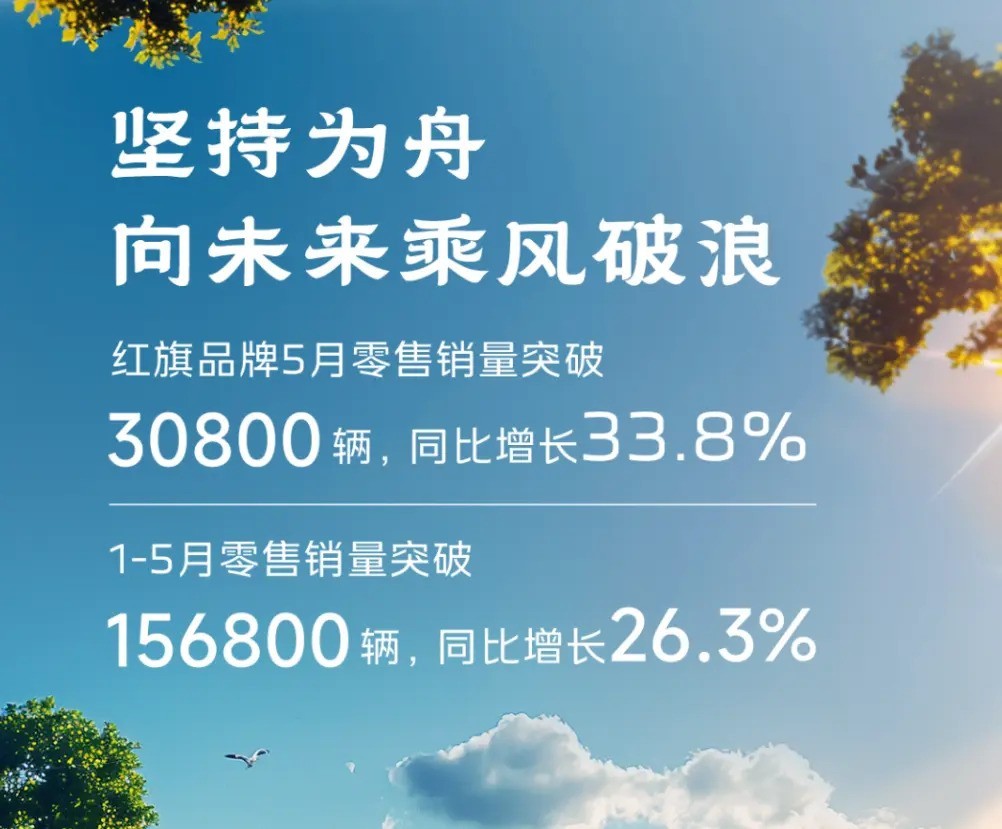 一汽红旗最新销量突破30800辆,同比增长33.8%。1-5月零售销量超过156800辆,同比增长26.3%。尽管5月份单月销量达到3万辆,但要实现2024年的目标,平均单月销量至少需要维持在3.5万辆的水平。
