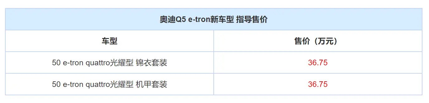 上汽奥迪Q5 e-tron 50 e-tron quattro光耀型正式上市,售价为36.75万元。这款车型基于MEB平台打造,与现有奥迪e-tron家族保持一致,并配备了矩阵式LED大灯、主驾驶座椅记忆、前后排座椅加热和后排隐私玻璃等实用配置。