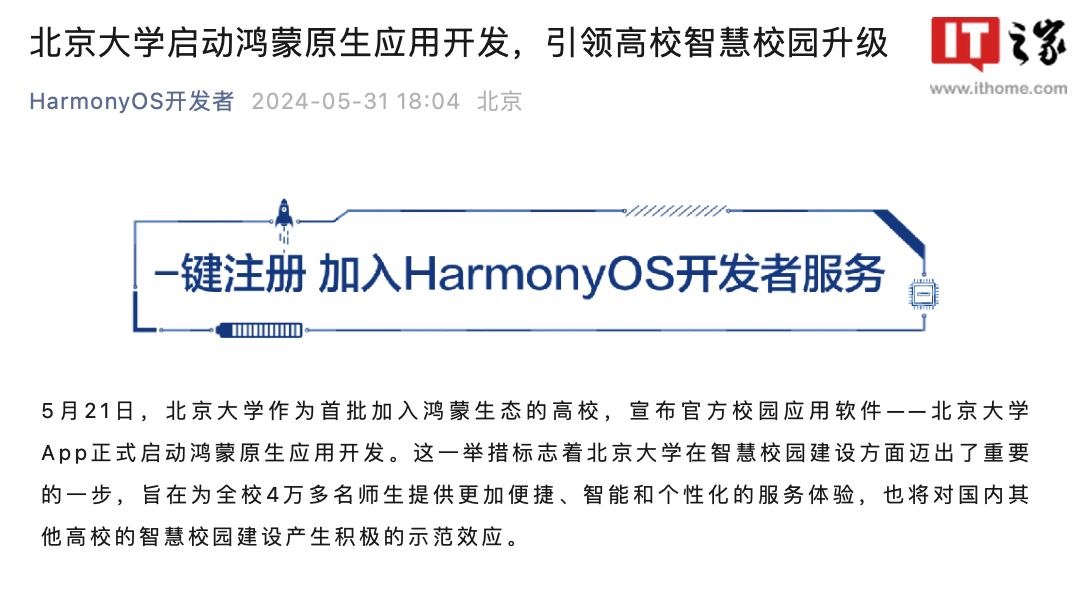 北京大学启动鸿蒙原生应用开发,将推出官方校园服务软件"北京大学"App,提供多项功能如OA办公、身份认证、在线选课、成绩查询、一卡通及生活服务。师生只需一部手机即可享受校园生活的各种便利。