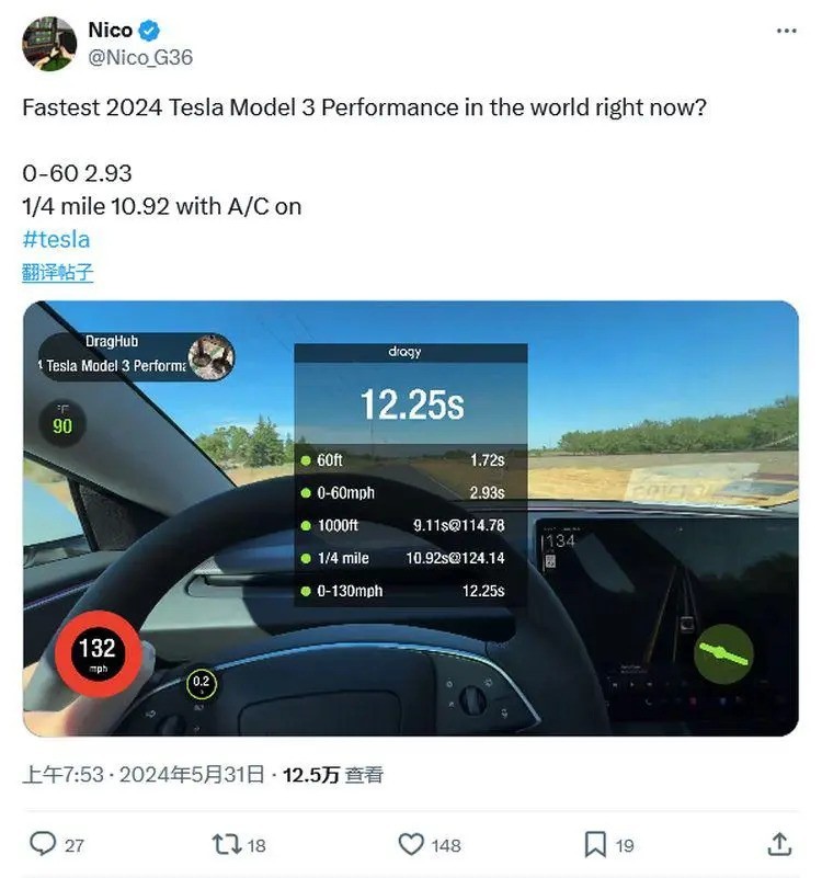 近日,新款Model 3的性能数据引发了网友的关注。在普通公路上进行测试时,其最高时速达到了124.14英里/小时,并且仅用10.92秒就完成了0到400米的加速过程。据特斯拉官网公布的信息显示,新款Model 3高性能版的0到60英里/小时的加速时间为2.9秒,最高时速可达163英里/小时...
