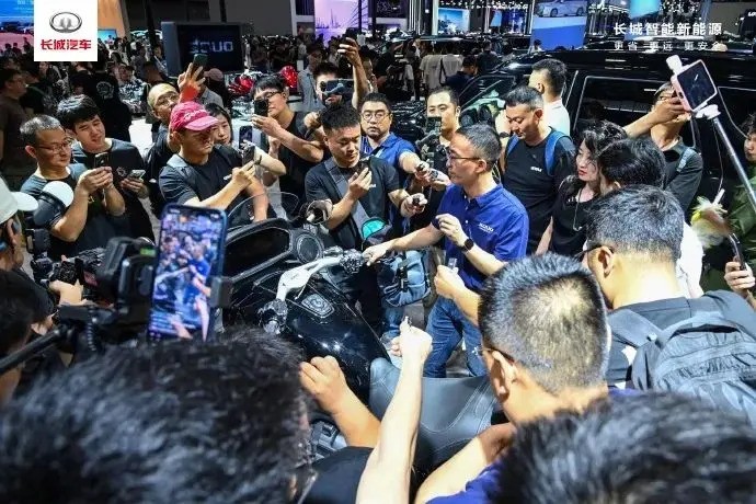 在长城汽车展台前,人潮涌动,吸引了众多慕名而来的汽车摩托车爱好者以及被长城三件套所吸引的朋友。整个展台氛围非常火爆。