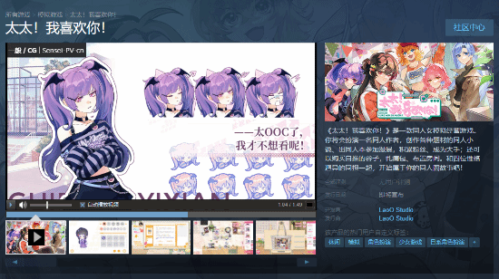 同人圈模拟经营游戏《太太!我喜欢你!》已在Steam平台上架,预计将于2024年年内正式发售。由LaoO Studio制作,玩家将扮演一名同人女,在游戏过程中体验从灵感收集、故事创作到参加漫展的完整过程,逐步成为同人圈大手,并在过程中收获来自伙伴的珍贵情谊。