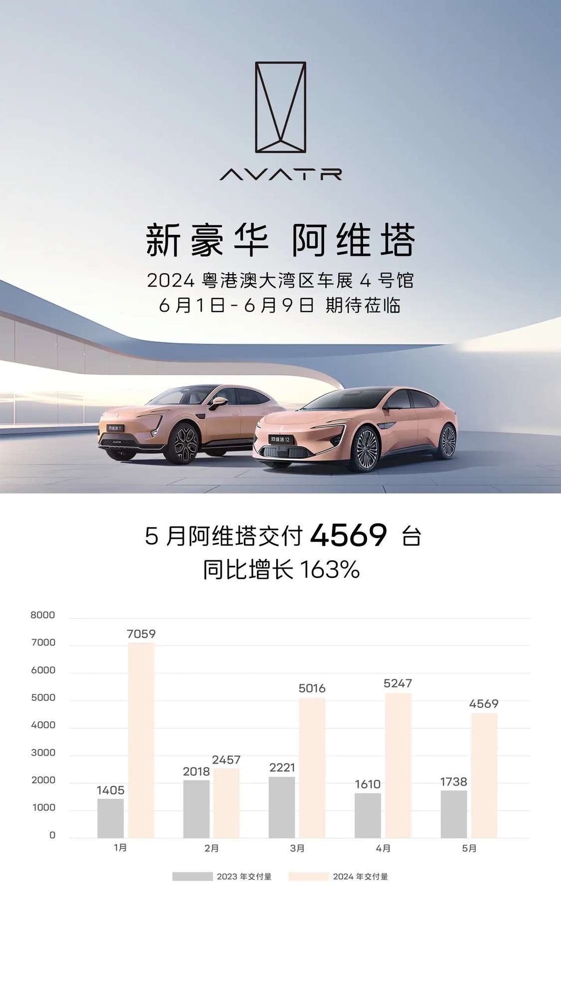 6月1日,阿维塔官方发布最新消息,5月份新车交付数量达到4569台,同比增长163%。同时,该品牌还宣布将在2024年的粤港澳大湾区车展上推出他们的两款旗舰车型——阿维塔11和阿维塔12。