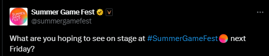 夏日游戏节即将到来,官方推文发文为活动预热:“各位期待在下周五的展会舞台上看到哪些作品?”评论区的玩家们纷纷给出了自己的答案,如《空洞骑士:丝之歌》、《对马岛之魂2》、《生化危机9》、《王国之心4》、《GTA6》、《古墓丽影》新作等。
