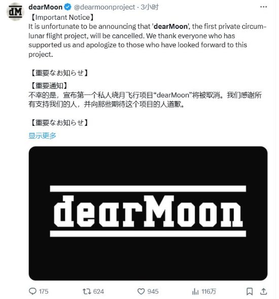 6月1日,日本亿万富翁前泽友作宣布取消了他计划的“亲爱的月球”(dearMoon)任务,这是一项私人飞往月球的计划。