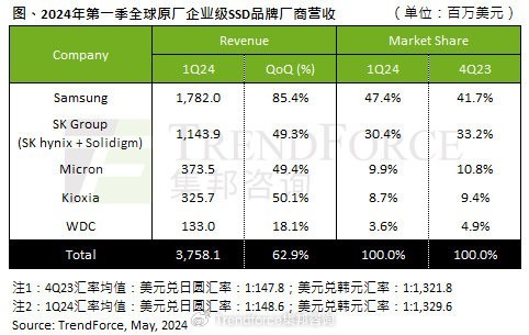 根据TrendForce的研究显示,2024年第一季度企业级SSD营收达到37.58亿美元(约272.83亿元人民币),环比增长62.9%。这一结果是由于大容量订单需求尚未得到完全满足,以及其它终端产品计划增加采购导致的。