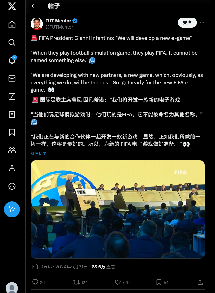 近日,国际足联主席因凡蒂诺在会议上透露,国际足联正在与新的合作伙伴合作开发一款全新的 FIFA 系列电子游戏。他表示,足球模拟游戏就叫 FIFA,对于全世界数以亿计的少年儿童来说,当他们玩足球模拟游戏时,他们玩的就是《FIFA》,不能被冠以其他名称。因此,这款新游戏将会延续“最好的”一贯风格。