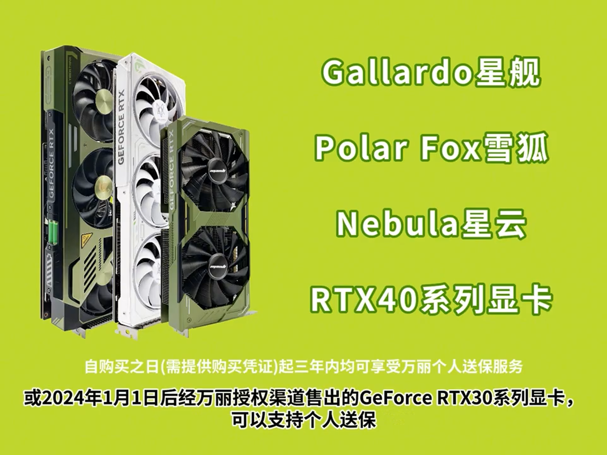 栢能集团旗下显卡品牌万丽近日宣布,部分显卡将提供个人送保服务。这项服务仅适用于玩家购买的Gallardo 星舰、Polar Fox 雪狐、Nebula 星云三大系列RTX40 系列显卡以及2024年1月1日后经万丽授权渠道售出的RTX30 系列显卡。