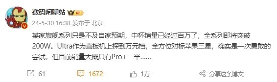对于华为来说,华为Pura 70系列的发售,是一件非常重要的事情,外界也对于华为Pura 70系列的销量抱有非常高的期待。微博用户“数码闲聊站”爆料称,华为Pura 70全系的销量马上就要突破200万,这对于发售不久的高端手机来说,销量还是可以的。
