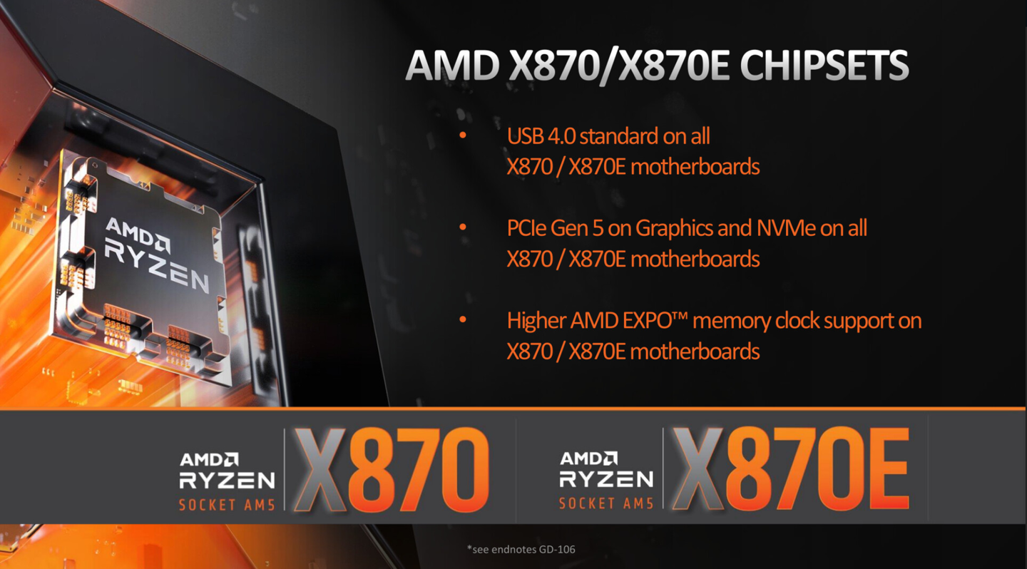 新的800系列X870和X870E芯片组与现有的锐龙7000和8000系列处理器完美兼容。同时,AMD也保证所有X870和X870E主板都将支持USB 4.0技术以及PCIe 5.0 GPU和NVMe存储设备。此外,新推出的芯片组还具备更快速度的AMD EXPO功能(最高可达8000 MT/s)。
