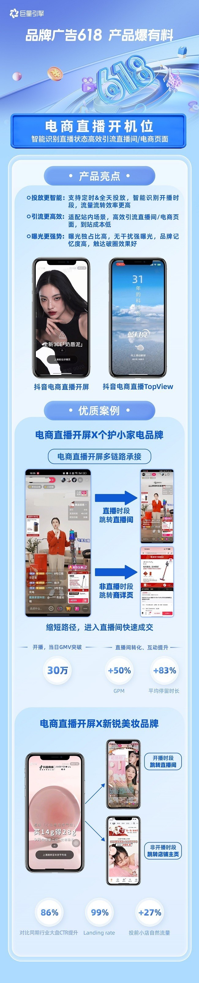 电商直播开机位强势曝光,第一视觉抢占用户心智,强化品牌记忆点,智能识别开播时段,适配站内场景,完整沉浸触达,提升流量流转效率的同时,缩短转化链路,有效降低到站成本。