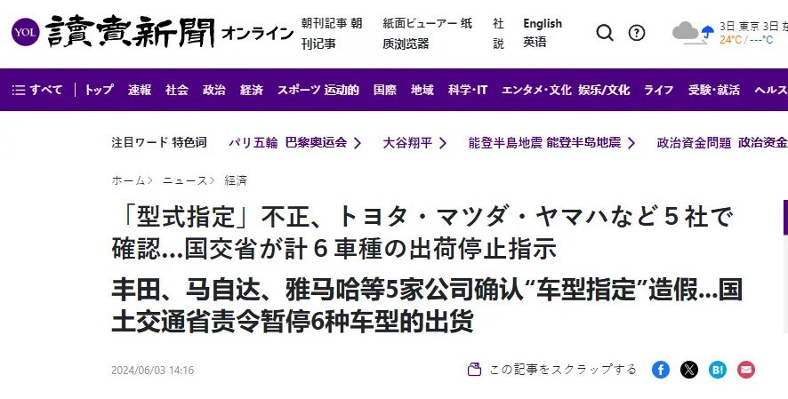 据日媒报道,日本国土交通省于6月3日发布了消息,指示共85家汽车生产公司进行调查,以确定是否存在违规行为。根据道路运送车辆法,丰田汽车、马自达、雅马哈发动机、本田技研工业和铃木等五家企业在车辆性能测试等方面存在造假行为。这五家公司将会接受调查。