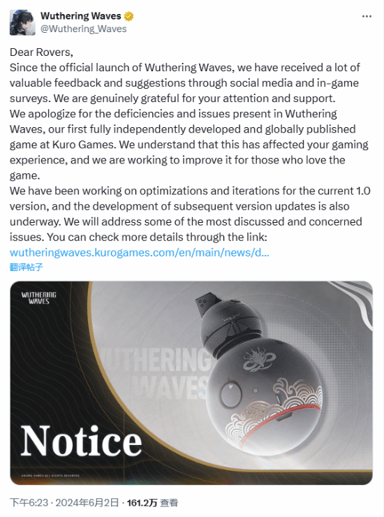 近日,《鸣潮》官方针对公测后的问题向国内玩家表达了歉意,并承诺给予补偿。这一声明在X平台引起了广泛关注和讨论。