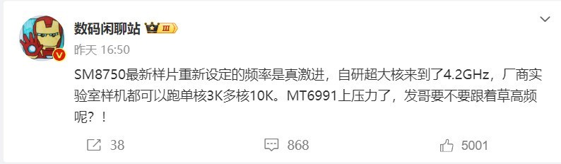 近日,知名数码博主“数码闲聊站”披露了高通骁龙8 Gen 4处理器的最新样片数据,揭示了这款未来旗舰芯片的强大性能。据悉,骁龙8 Gen 4的自研大核心频率已达到惊人的4.2GHz,相较于当前市场上的骁龙8 Gen 3,其X3超大核主频从3.2GHz提升至4.2GHz,这一跨越式的频率增长在芯片发展史上实属罕见。