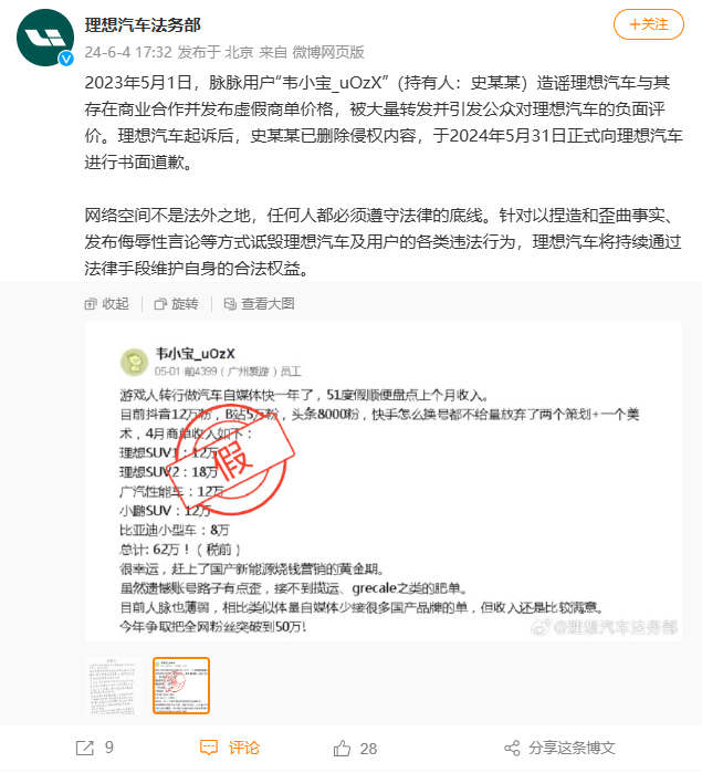 理想汽车官方今日宣布,一名用户史某某在被起诉后已删除其在脉脉平台发布的虚假商业合作和价格的造谣内容,并于2024年5月31日向理想汽车进行书面道歉。同时,还有其他网友发布了理想汽车车辆集中存放于大型停车场的照片,并宣称“理想汽车新车集中上牌后充当二手车对外出口”、“理想汽车销量数据造假”。