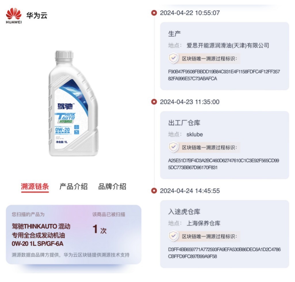 目前,驾驰润滑油的流通环节将全路径“上云”。华为云区块链已实现对每一瓶驾驰润滑油从工厂生产、在途运输、渠道库存到终端消费全链条追踪,确保路径信息不可篡改、不可分割、不可复制、可追溯。在途虎养车平台选购驾驰润滑油时,消费者用手机扫一扫包装上的二维码,所购商品的全链路流转信息就会完整显示,真伪溯源验证一目了然。