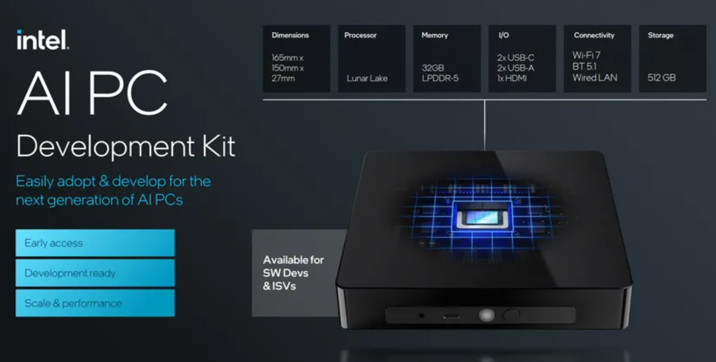 与此同时,官方还推出了AI PC开发套件,搭载Lunar Lake处理器、32GB LPDDR5内存和512GB存储。该产品整体类似方盒子造型,尺寸为165x150x27mm,支持Wi-Fi 7、蓝牙5.1,并配有2个USB-C接口、2个USB-A接口、HDMI和有线网口。
