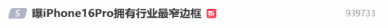 iPhone 16 Pro系列的边框将打破历史纪录,做到了行业最窄。该博主表示,iPhone 16 Pro的黑边只有1.2mm,而iPhone 16 Pro Max的黑边则更窄,只有1.15mm。这个消息传出后,“曝iPhone 16 Pro拥有行业最窄边框”登上了微博热搜第五名。