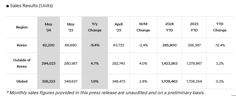 感谢网友科技先行者、华南吴彦祖的线索投递!现代汽车公司最新公布了2024年5月全球销量数据。全球销量总计达到了356,223辆,同比增长1.9%。其中,电动汽车销售超过了17,000辆。