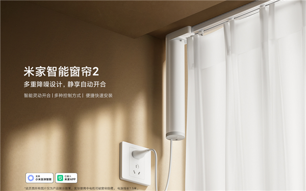 这款智能窗帘所使用的电机经过了多重降噪和减震结构设计,可以驱动60公斤的帘布,并且电机运行噪音小于等于26dB。此外,米家智能窗帘2还具备自定义开合行程和比例的功能,并支持无极调速,在使用者需要时会自动调整到合适的速度。