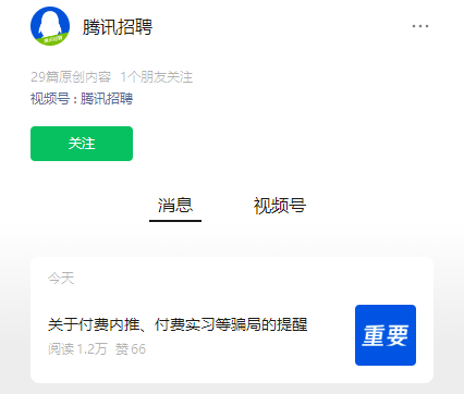 腾讯明确表示,公司所有的实习岗位都不收取费用,并对涉及此类行为的员工进行了严格的纪律处分。同时,腾讯强调内推只是简历投递的一种方式,并不是必要的流程阶段。