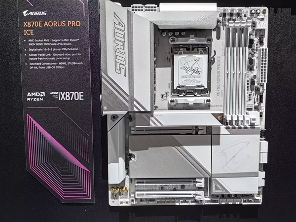 除了高端的X870E系列外,技嘉还展示了其全新背插主板——B650E AORUS STEALTH ICE。这款主板是全球首款白色背插设计的产品,在外观上为追求高颜值和个性化装机的玩家提供了新的选择。同时,它还采用了Ez-Latch Click快易拆M.2散热器设计,无需螺丝即可安装M.2 SSD。