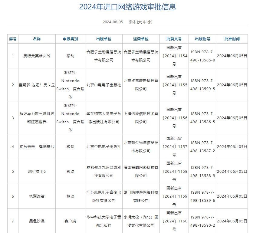 6月5日,国家新闻出版署发布了最新一批《2024年进口网络游戏审批信息》,共有15款游戏入选。这些游戏覆盖了多个平台,包括任天堂Switch上的《宝可梦 走吧!皮卡丘》、移动端的《侍魂 晓》以及客户端上的《黑色沙漠》。此次审批名单中的游戏都是在经过严格审核后才被纳入批准范围内的。