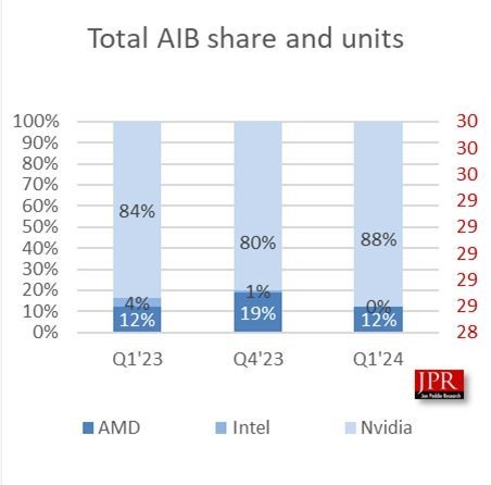 根据市场调查机构 Jon Peddie Research(JPR)最新公布的报告,2024年第一季度全球独立显卡(AIB)市场出货量为870万台,较上季度的950万台下降了7.9%,同比增长39.2%。