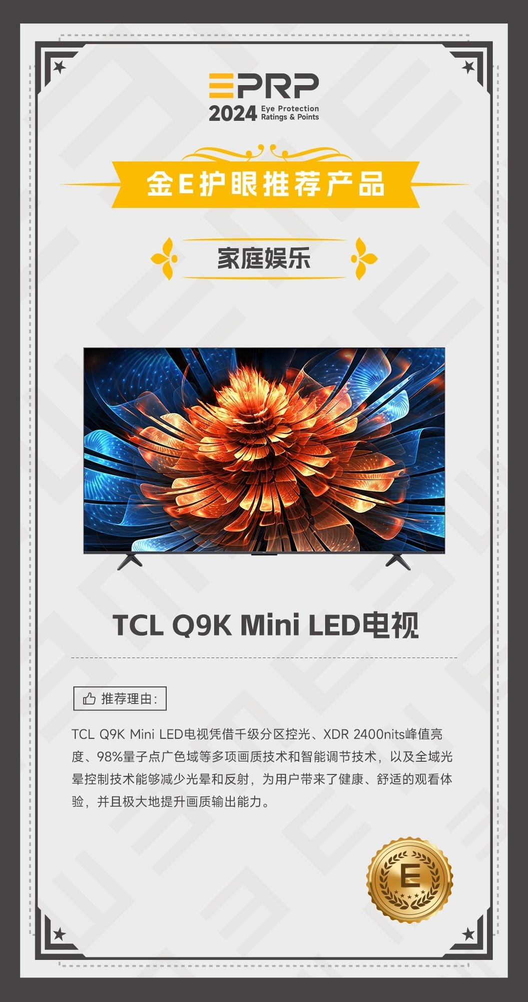 2024 金E护眼-家庭娱乐护眼推荐产品:TCL Q9K Mini LED电视