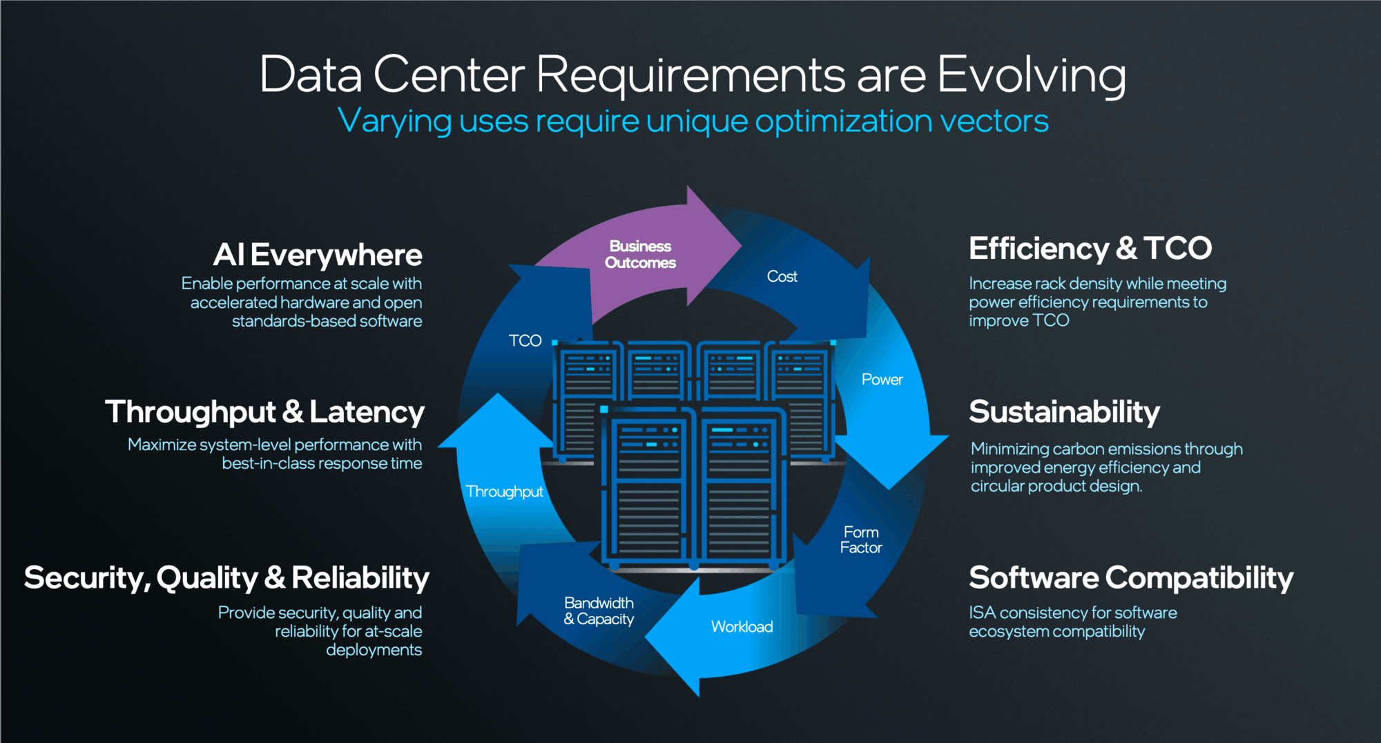 由AI催生的多样需求也让数据中心对服务器CPU有了更多的期待,首先在效率和TCO层面,目前AI技术架构内的很多设施都是非常昂贵的,并非所有企业都有足够的财力负担,因此,如何在数据中心的拓展中能够以更好的硬件或者更优的架构实现效率提升和成本的降低是至关重要的。