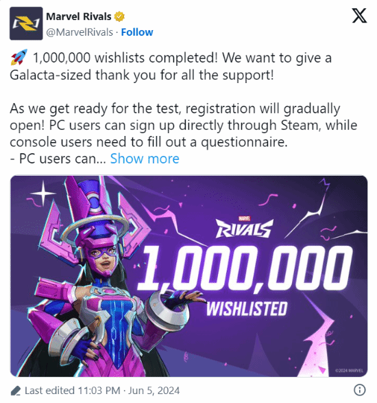近日,《漫威争锋》官方宣布,该游戏在Steam平台上的愿望单数量已经突破100万。这一数据充分展示了玩家们对这款游戏的高度期待。网易公司最近公布了《漫威争锋》的登陆计划,该游戏除了将在PC平台上发布外,还将进军主机市场。据官方消息,该游戏将于7月进行封闭测试。值...