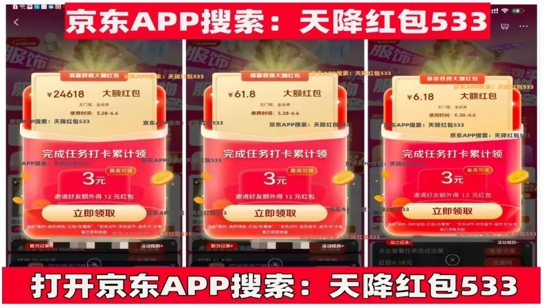 3.京东618超级红包6月7日0点开始,是京东第二波超红首发,京东APP搜:红包到手599,最高24618元,一定要蹲首发,超红先发先锁佣,多发多锁。完成活动页面的每日任务,可额外领取红包!