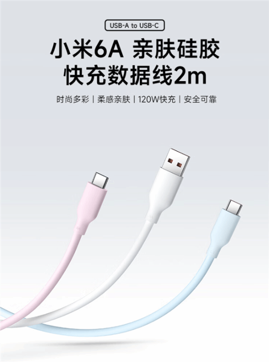 小米公司推出了一款全新的6A硅胶数据线,这款数据线长度达到了2米,并采用了USB-A口转USB-C口的设计。该产品提供粉色、白色和紫色三种时尚配色选项,首次发售价格为49元。
