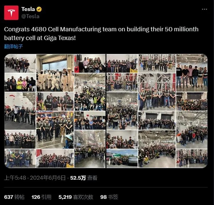 特斯拉在X上公布了4680电池新进展。目前,其位于美国得克萨斯州首府奥斯汀的超级工厂已生产了5千万个4680电池。得州超级工厂团队成员为此付出了巨大贡献。