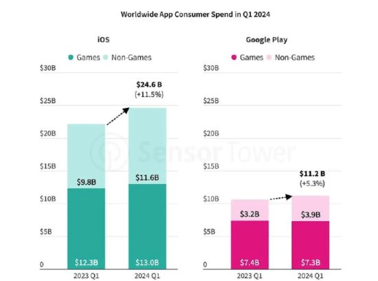 在手游方面,苹果App Store和Google Play的表现差异显著。据统计数据显示,2024年第一季度,在苹果App Store获得的游戏收入达到130亿美元,同比增长近6%。而Google Play的游戏收入则保持平稳,为73亿美元。