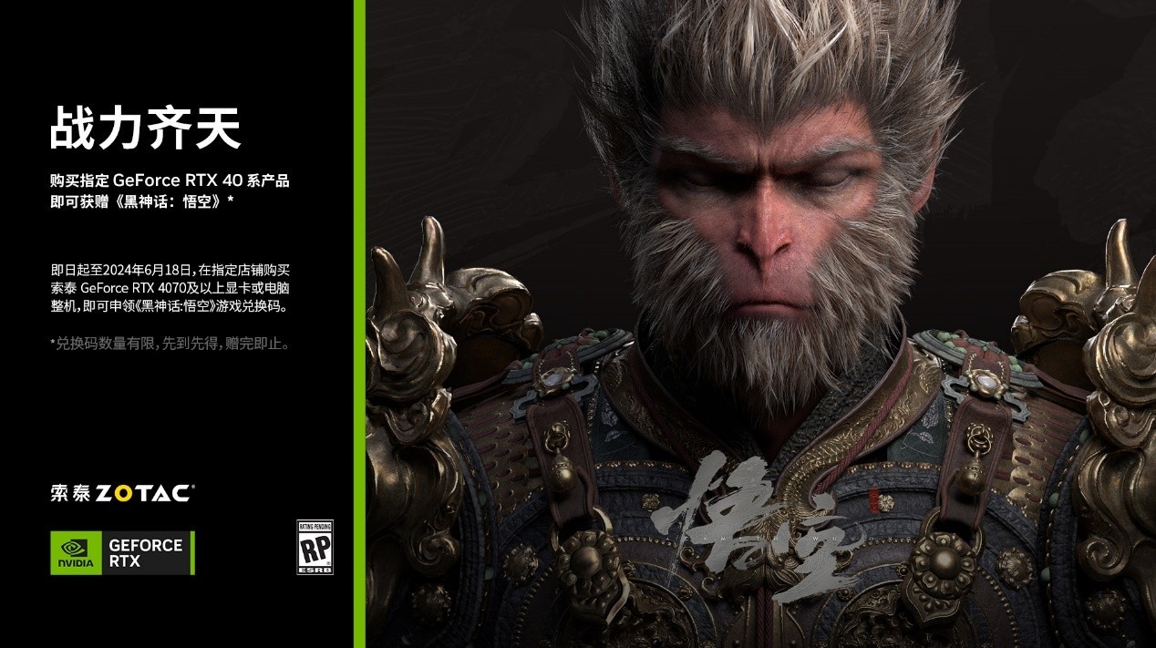 即日起至2024年6月18日,在指定店铺购买索泰GeForce RTX 4070及以上显卡或电脑整机,即可申领《黑神话:悟空》游戏兑换码。