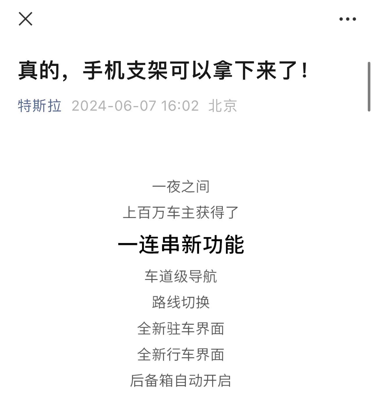 特斯拉官方账号于6月7日宣布,最新版本的FSD(全自动驾驶)12.4.1软件已经向上百万名车主提供了新功能。其中包括车道级导航、路线切换、全新的驻车界面和行车界面,以及后备箱自动开启等所有这些功能均为免费。
